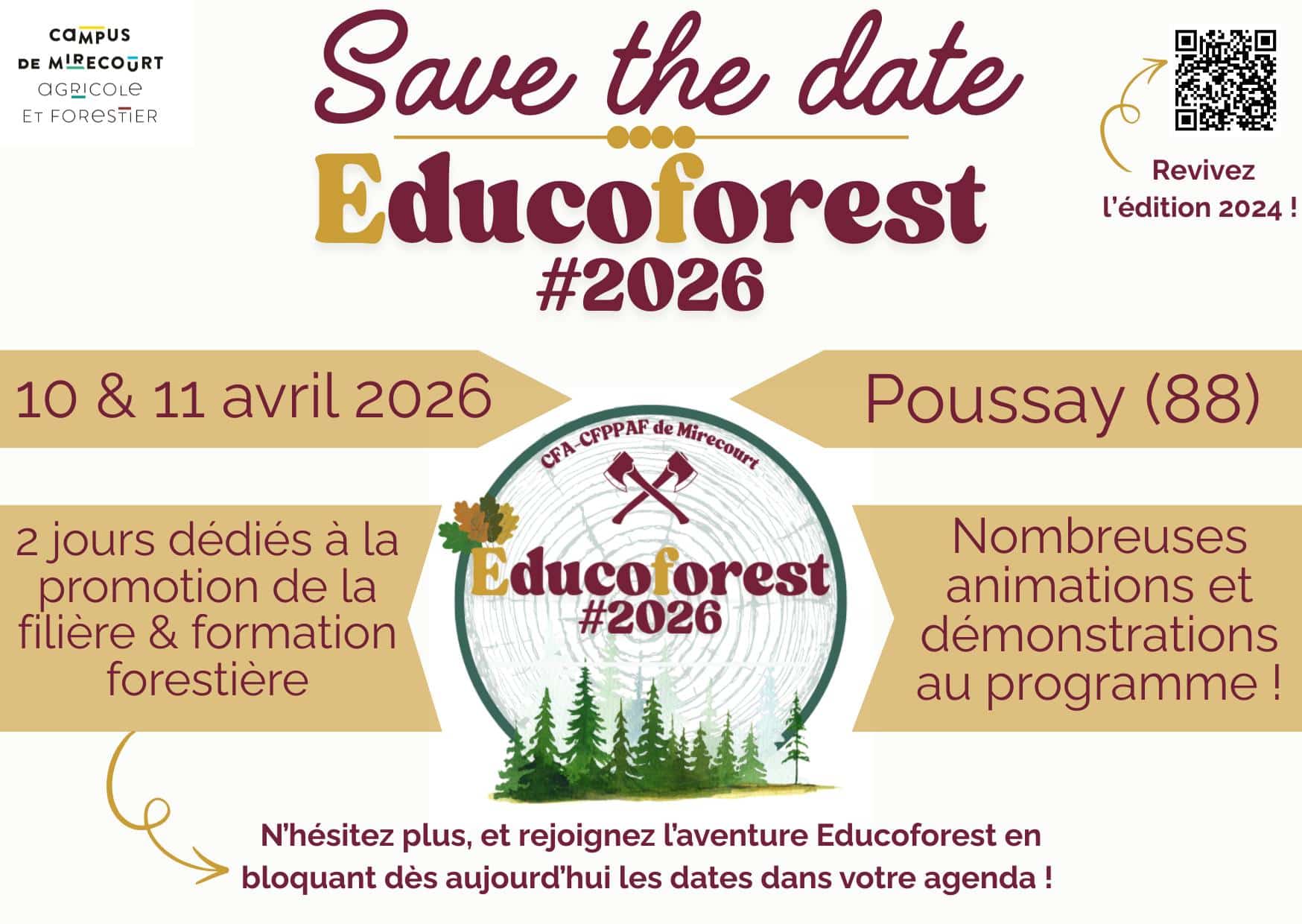Après le succès de la première édition d’Educoforest en 2024, qui a réuni une trentaine de partenaires et attiré près de 800 visiteurs, le Campus Agricole et Forestier de Mirecourt organise une nouvelle édition les 10 et 11 avril 2026 sur le plateau technique forestier de Braquemont, à Poussay.