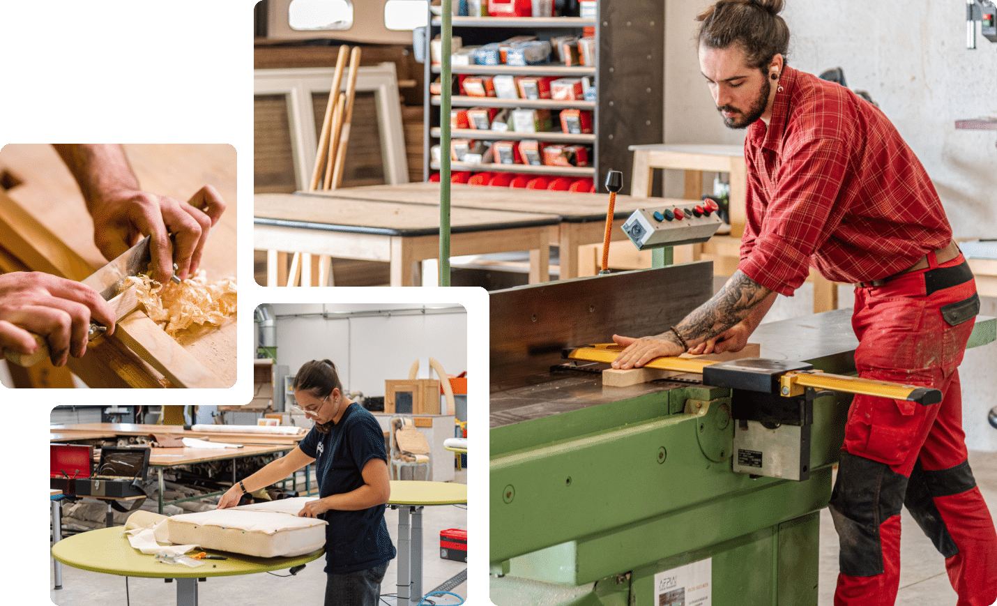 - Atelier Tapisserie d’Ameublement en Siège (400 m²) : un espace pratique et créatif, équipé de 14 tables ergonomiques, pour perfectionner le savoir-faire dans la tapisserie d’ameublement.