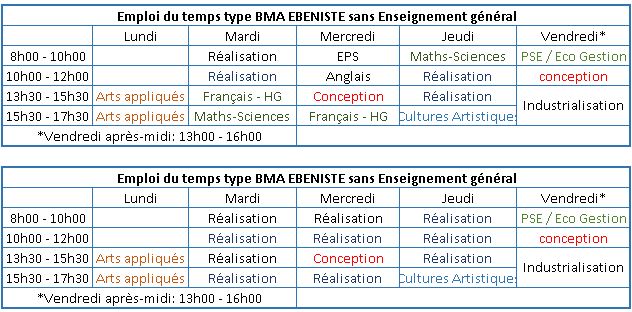Les contenus de la formation BMA Ebéniste sont déterminés au plan national par le référentiel du diplôme qui définit les programmes, l’organisation des enseignements, le règlement et la nature des épreuves de l’examen.