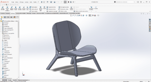 Cette étape a permis : la modélisation complète du fauteuil, la validation des assemblages, l’optimisation des formes et des sections.